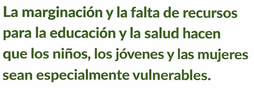 La brecha entre una minoría que acapara las riquezas del país y una mayoría desposeída, crece, especialmente en las zonas rurales. Marginación, carencia de recursos para educación y salud, hacen que especialmente niños, jóvenes y mujeres se vean sometidos a situaciones de injusticia, hambre, mendicidad, abuso infantil, prostitución, epidemias y enfermedades de transmisión sexual. La malaria, el sida, las minas antipersona, mutilan a una población con una media de edad de 29 años.